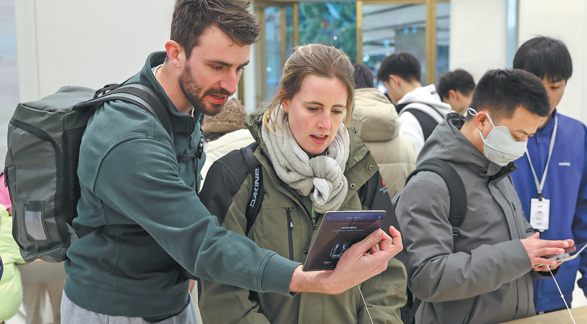 Чуждестранни потребители проверяват електроника във водещ магазин на Huawei в Шанхай на 3 януари. CHINA DAILY